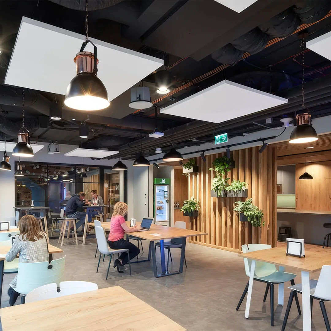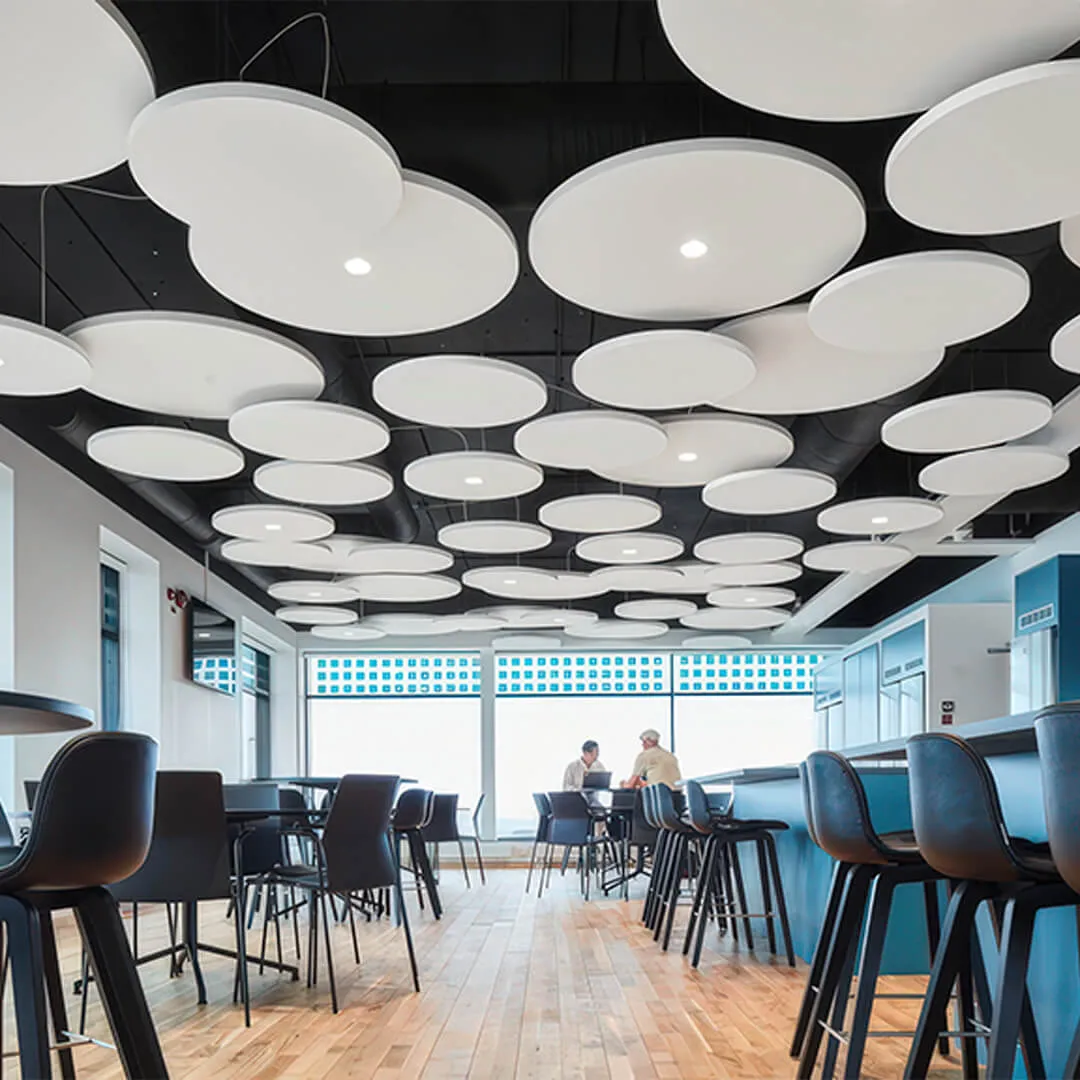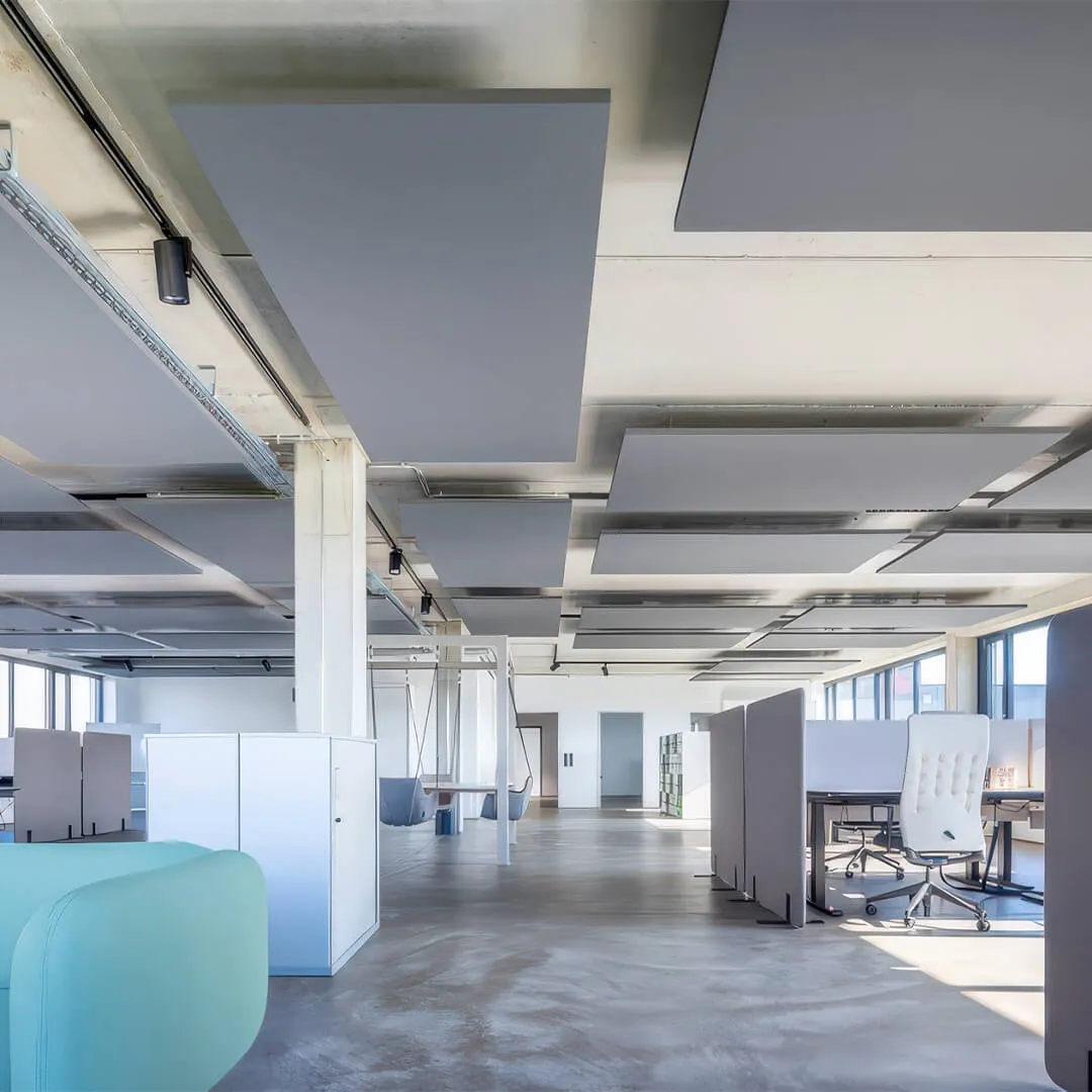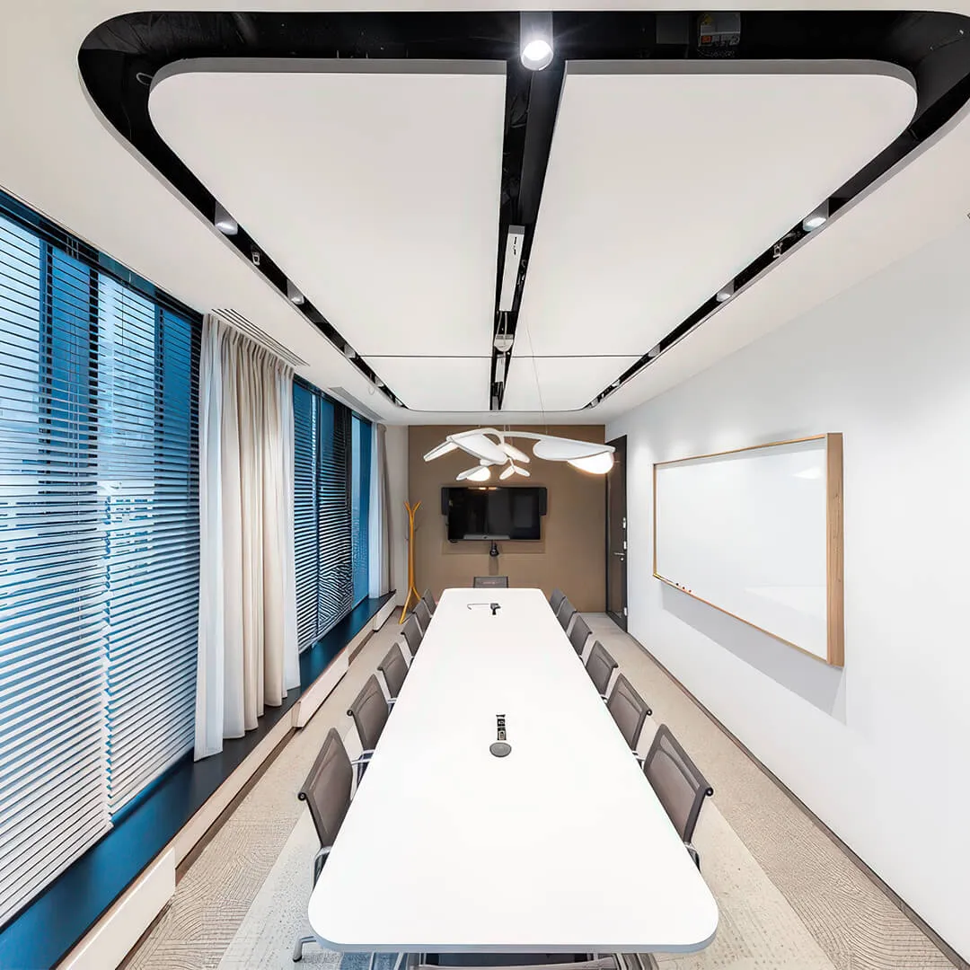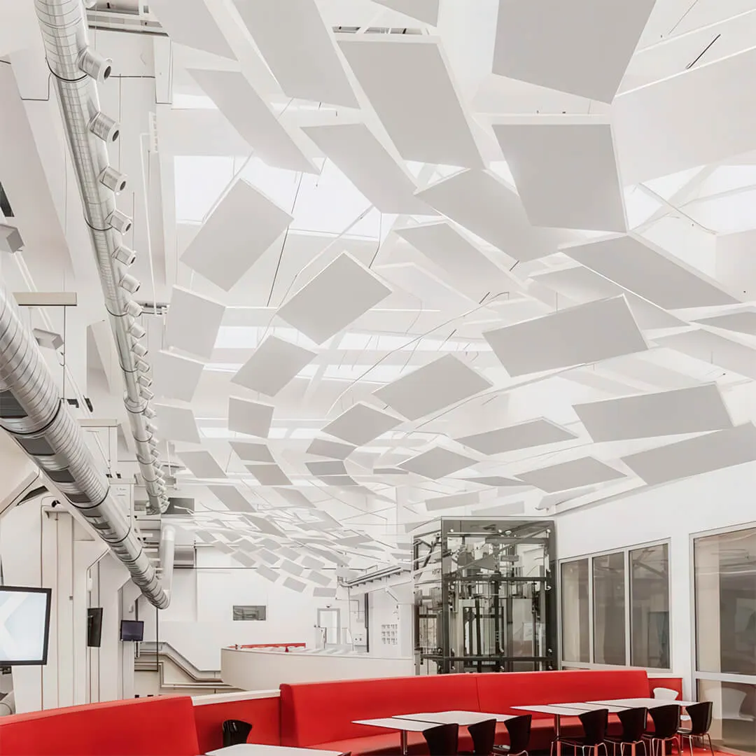 • Системы для открытых пространств: подвесные панели и облака, которые эффективно снижают шум в больших помещениях.