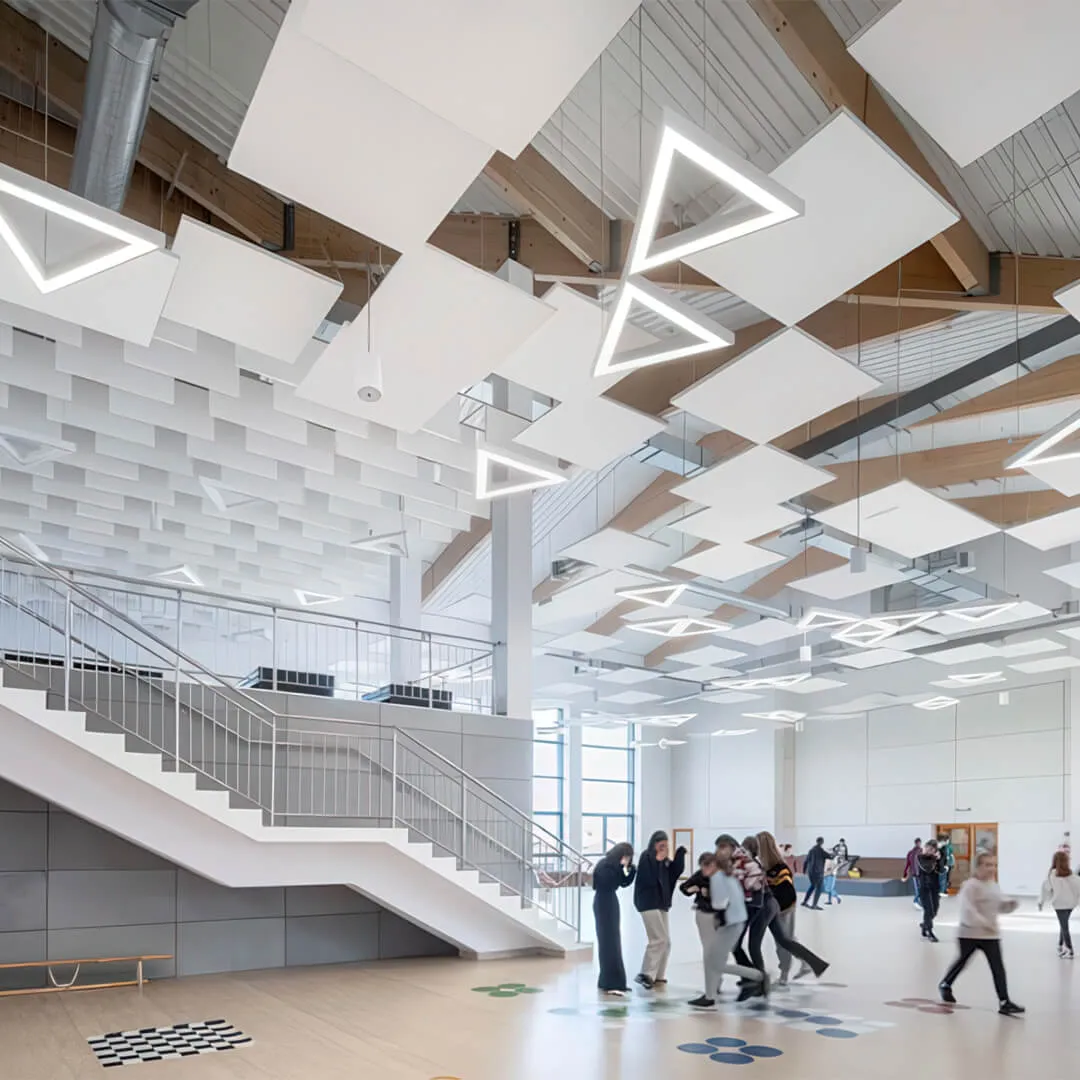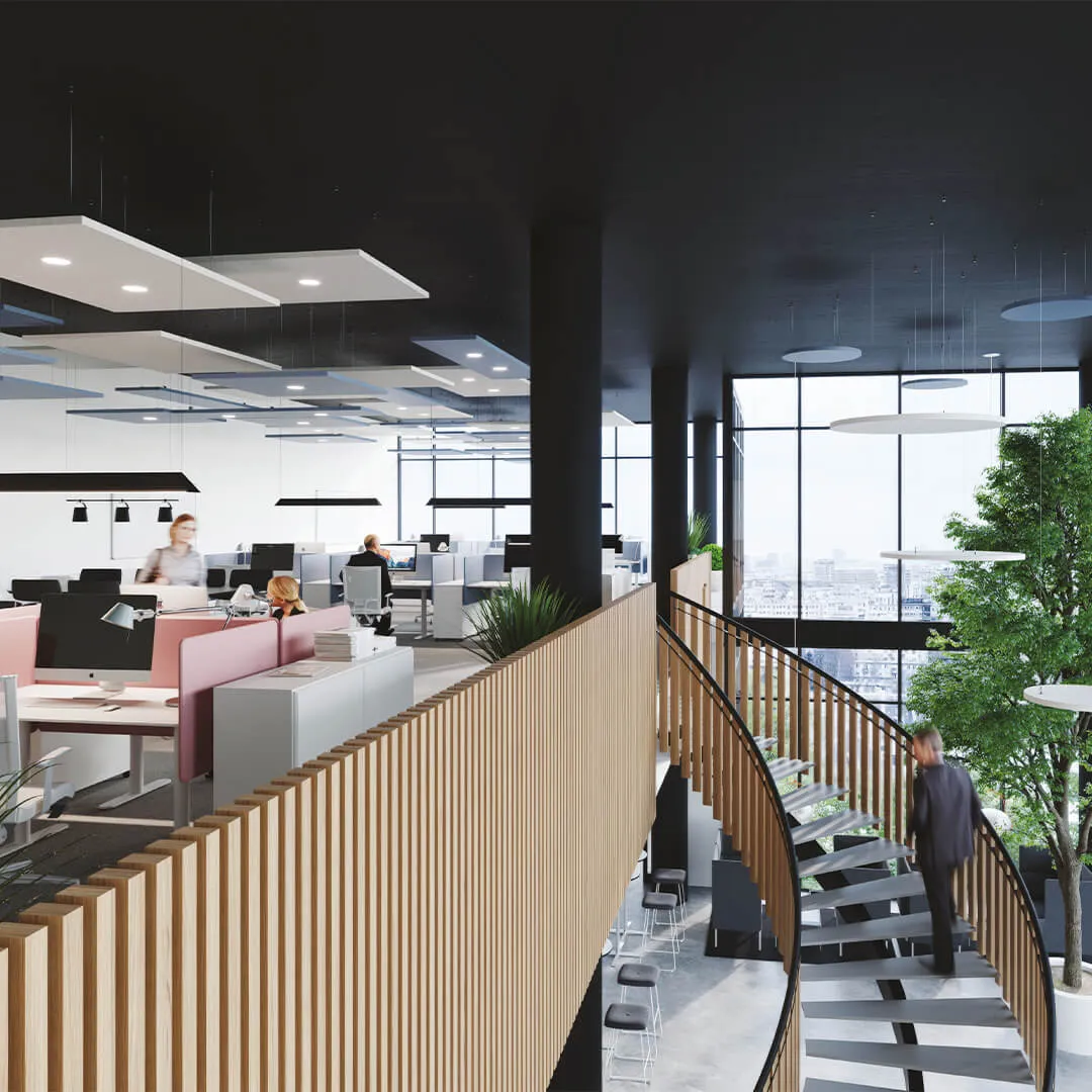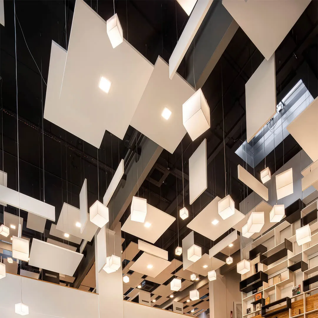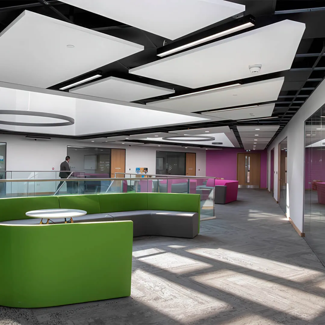 • Системы для открытых пространств: подвесные панели и облака, которые эффективно снижают шум в больших помещениях.