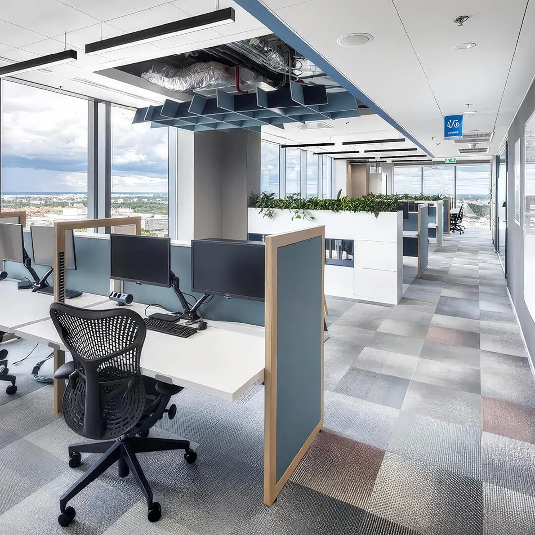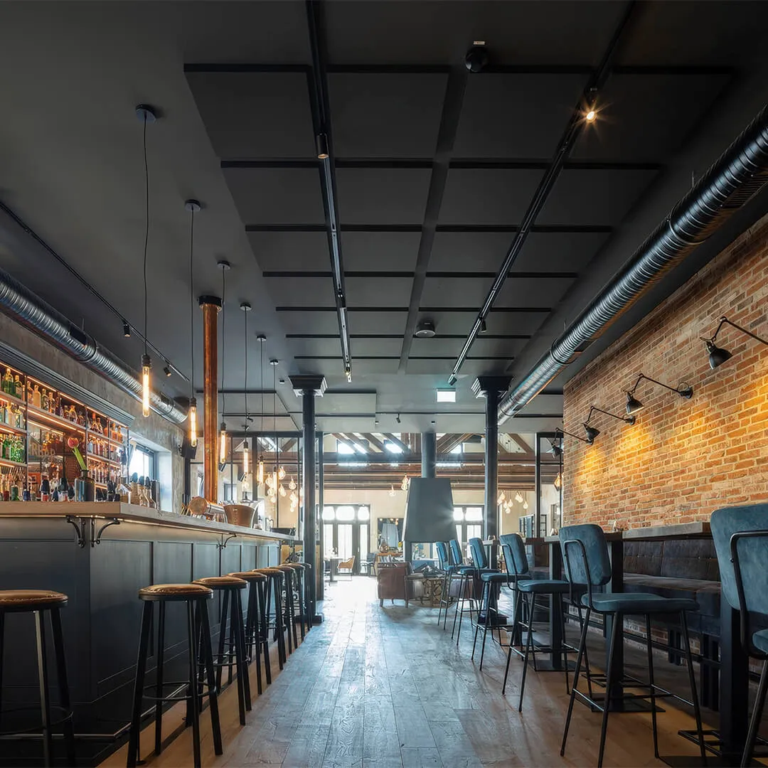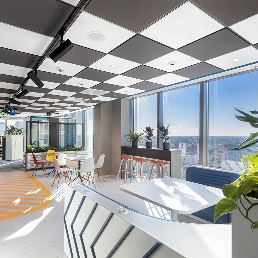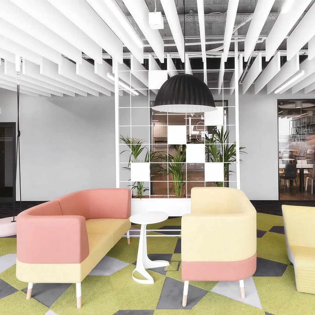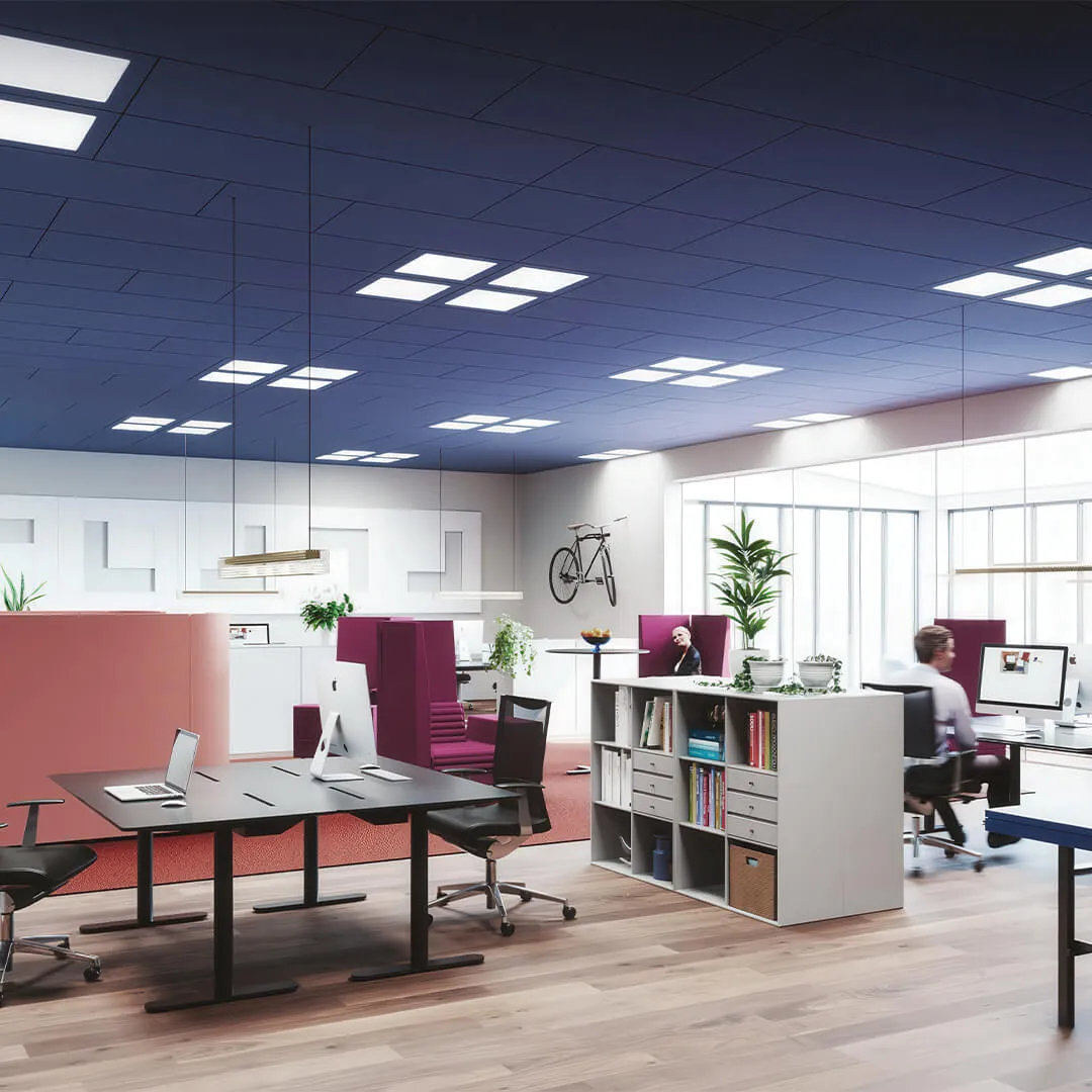 • Системы для открытых пространств: подвесные панели и облака, которые эффективно снижают шум в больших помещениях.