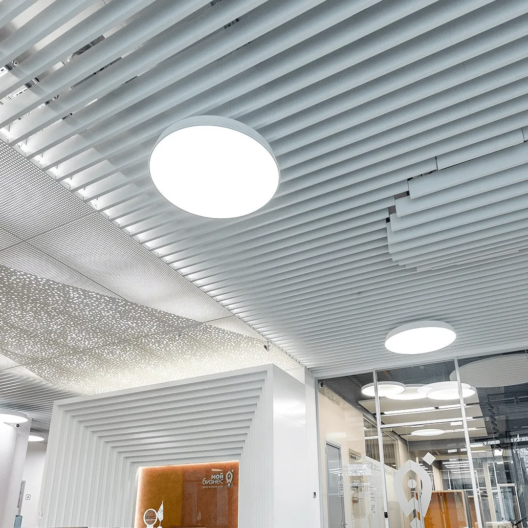 - Реечные потолочные и стеновые системы: металлические ламели, доступные в различных цветах по шкале RAL, а также с текстурами ценных пород дерева. Возможен монтаж в разных плоскостях и с различным шагом, включая установку "волной".